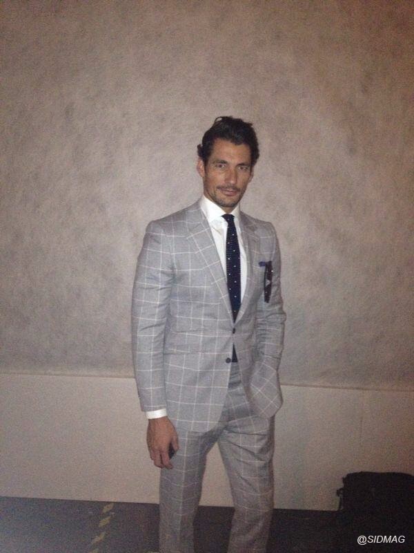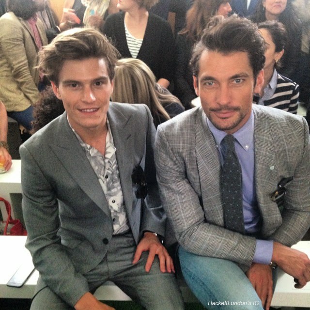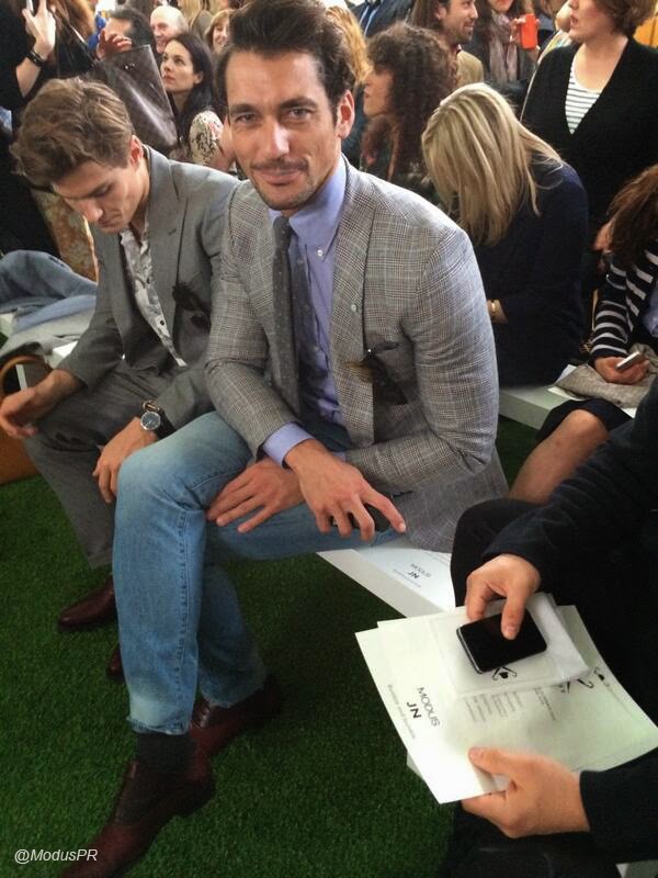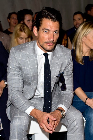 Day 2 of London Collections:Men SS 2015 saw David Gandy in a more relaxed outfit for the day. He enjoyed most of the shows from his usual front row seat with fellow model Oliver Cheshire. For the last show of the day David changed into another beautiful gray suit which will take him into the evenings festivities.